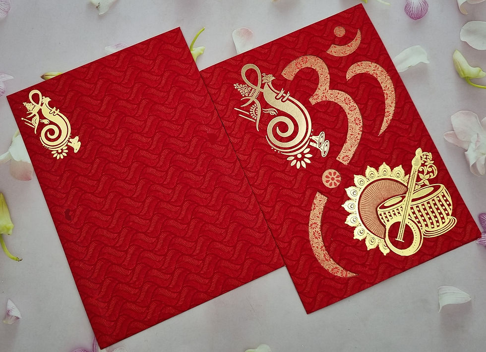 Om Shree Ganesh Red and Beige with Gold Wedding Invitation Card