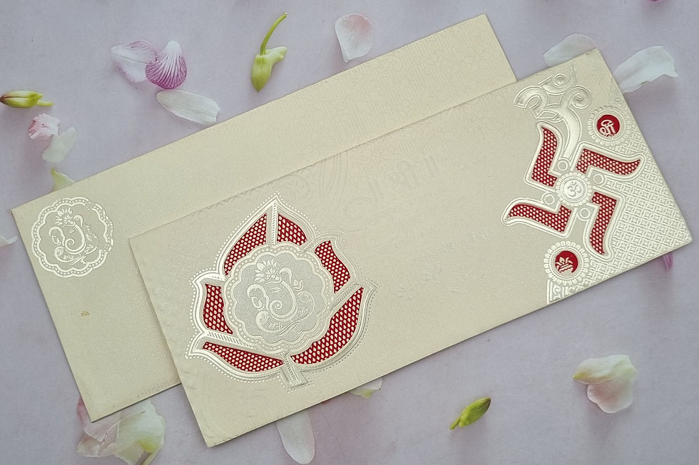 Laser Cut Swastik Ganesh Red and Cream Colour Wedding Invitation Card